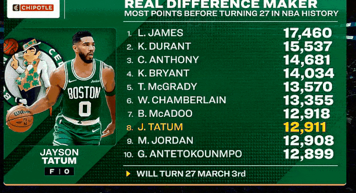 第二节比赛,塔特姆本场已得3分,超越乔丹升至27岁前得分榜第8。